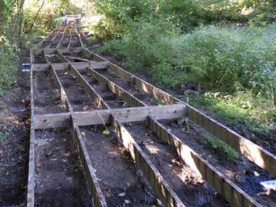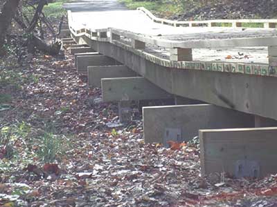 The walkway gently follows the lay of the land. Strong double 2x8 laminated beams are set every 8' with another deck foot under a support post every 16'. Remember, Jim had to remove the existing support posts that were set into the ground because they were so badly rotted.