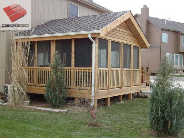 A permanent covered deck structure but totally screened in for the summer. This builder made this deck work perfectly with the home and backyard. The landscaping completes the look.