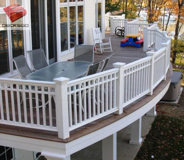 A traditional look of white railings with a darker ipe decking. The railing has nice detail with circular elements across the top the railing panel. It's finished off with a picture frame boarder around the decking and on a curve. Professionally built by a great builder.