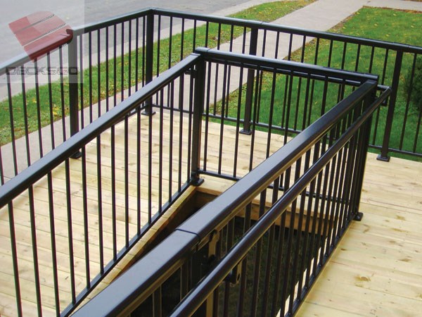 Full 180 degree corner on this landing leading to the sloped ramps for access to a school. Do it yourself aluminum rail system by Solution and available at the DecksGo store.