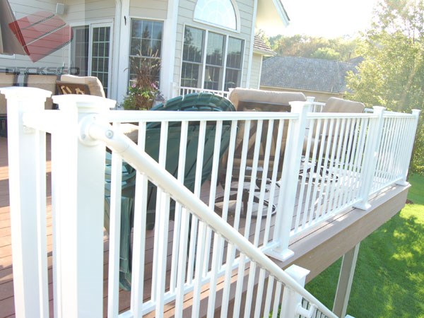 Another Solutions white aluminum rail and stair system the looks great and provides peach of mind to the homeowners. Aluminum system available at the DecksGo store.