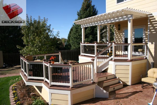 Check out this adventure in color, multiple levels, contrasting railing and baluster elements and classic white pergola. All the tiny details are there - recessed stair riser lighting, post caps... This is Shawn Miller building and designing at his best. We love his work!