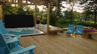 We did add more wood to the roof over the hot tub and on the bottom level we put in stones and a hammock, with another lounging area.