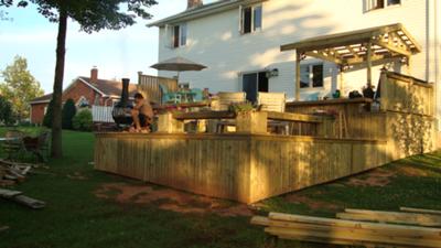 I decided to rip off the old small decaying deck and build a more roomy area for family fun. I designed the deck by drawing a plan, using 1 cm for one foot and went from there. I asked my brother law what he thought about building it for me. He agreed and we got started.