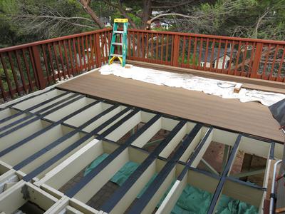 Apply butyl tape (aka: “bitchathane”) to tops of all joists. Paint all bare wood.